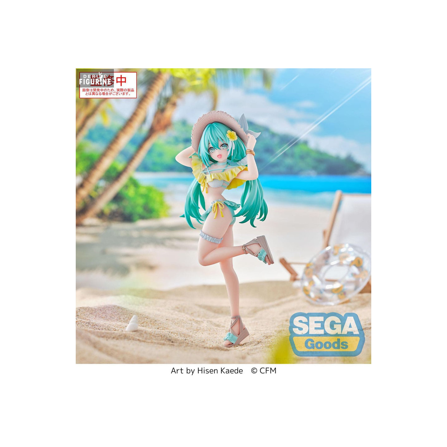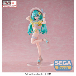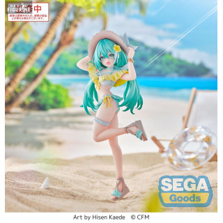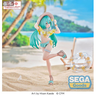 In this vibrant and refreshing design, Hatsune Miku wears a pastel-colored beach outfit, featuring delicate frills and elegant accessories. Her wide-brimmed straw hat adorned with a flower and matching sandals complete her summery look, making her the perfect representation of a breezy, joyful day by the ocean. Her cheerful expression and dynamic pose add a touch of energy and liveliness, making this figure a must-have for any fan of the virtual pop star.