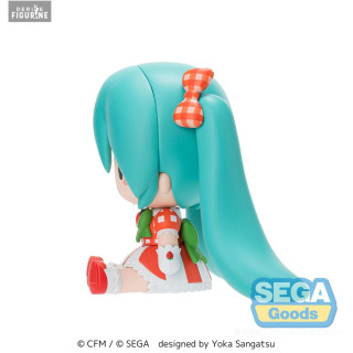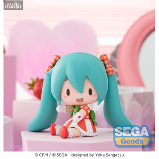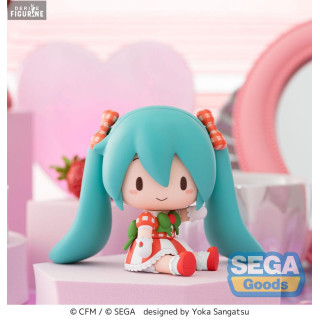 Official figure of Hatsune Miku, Lovely Strawberry in PVC which measures approximately 8 centimeters high. It is from the Fuwa Petit Chibi collection. The manufacturer is SEGA.
