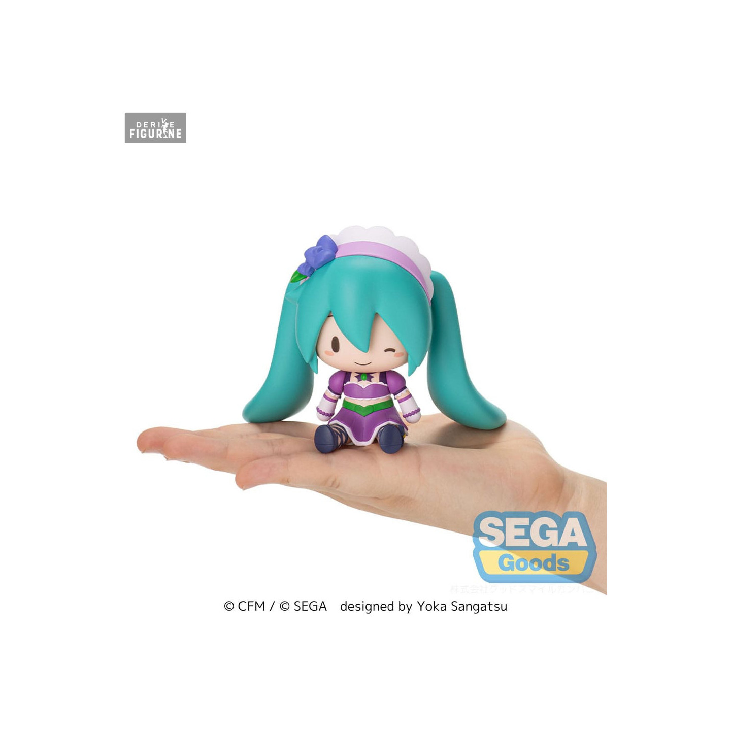 Official figure of Hatsune Miku, Sparkly Purple in PVC which measures approximately 8 centimeters high. It is from the Fuwa Petit Chibi collection. The manufacturer is SEGA.