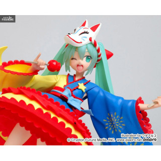 Miku Hatsune is back in a brand new outfit that is very colorful. She holds a fan and a love apple, on her head is a mask and finally, we can see fireworks on her sleeves. This does not make you want to go for a ride at the carnival?