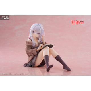 This "Casual Clothes" version of the Elaina figure captures the witch in a moment of relaxation. Made of PVC, it stands approximately 13 centimeters tall and is part of Taito's Desktop Cute collection. The figure depicts her sitting elegantly with her legs crossed, holding a book in one hand—a pose that perfectly reflects her love for reading and learning. Dressed in casual attire, her loose sweater and short skirt showcase a modern yet refined style, revealing a different side of her character who is usually clad in her witch's outfit. Her serene expression and delicately sculpted silver hair add a touch of softness to the figure. This representation of Elaina in everyday clothes highlights her human and simple side, contrasting with the image of the powerful witch during her travels.