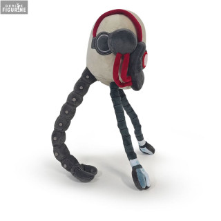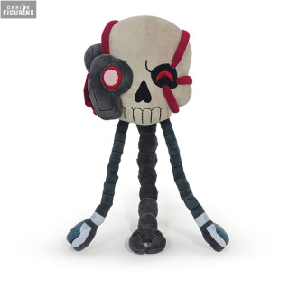 The plush features a large beige skull with embroidered details: a grey mechanical eye with a red lens, several bright red markings, and a black eye socket. Its three segmented tentacle-like limbs end in stylized blue and grey claws, ready to “hold” your imaginary gear. The stitching is neat, and the colors stay true to the game’s aesthetic.