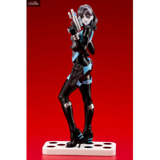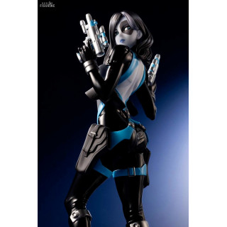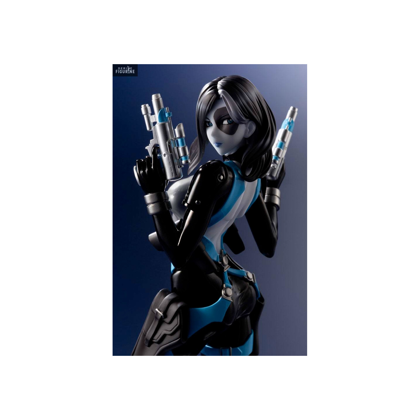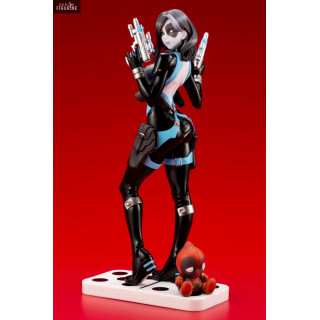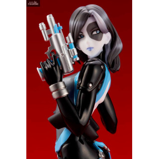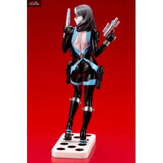 Domino is a mutant who has the ability to turn the odds in her favor. She is also an elite shooter who led the New Mutants with Cable after leaving the X-Men. This statuette is carved by Masahiro Takahashi, after a creation of Shunya Yamashita, and small nice detail: the Deadpool at her feet.