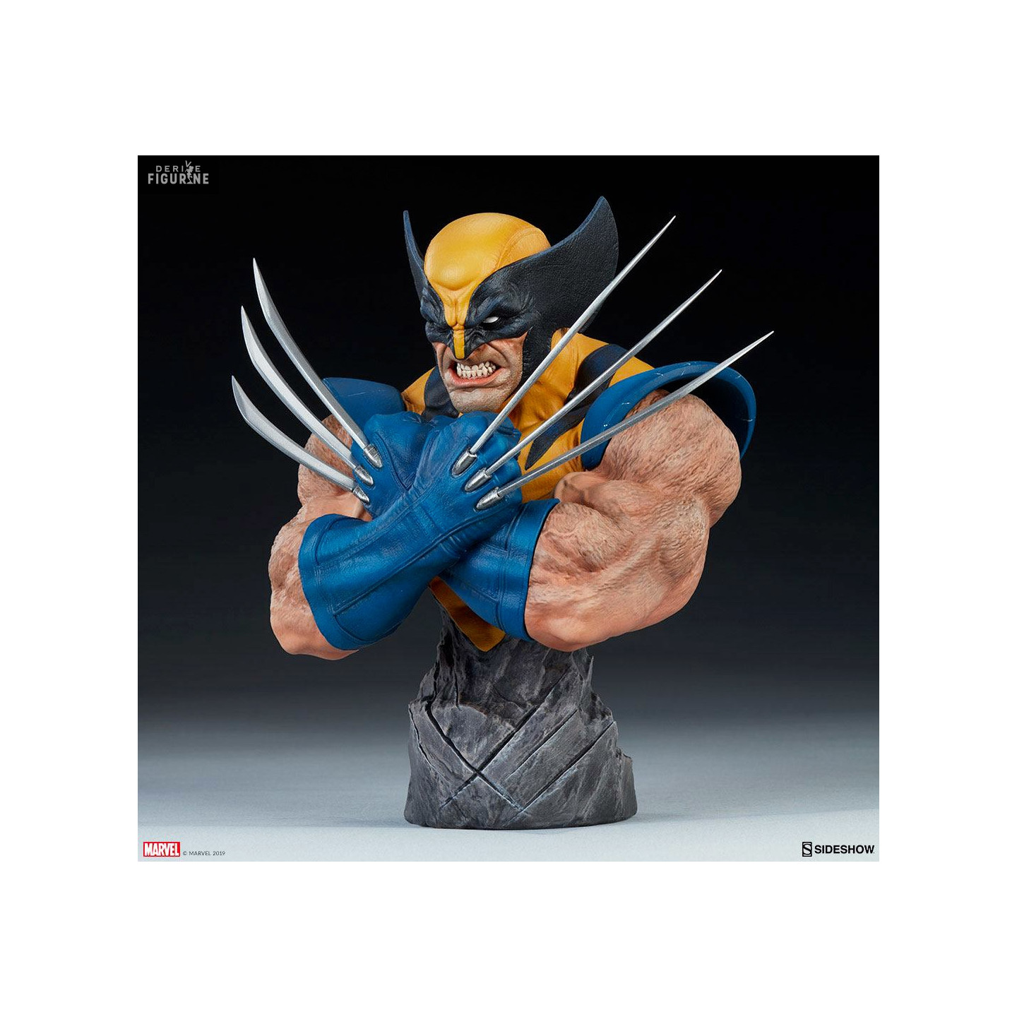 Official bust of Wolverine in resin which measures about 23x23x13 centimeters. The manufacturer is Sideshow Collectibles.
