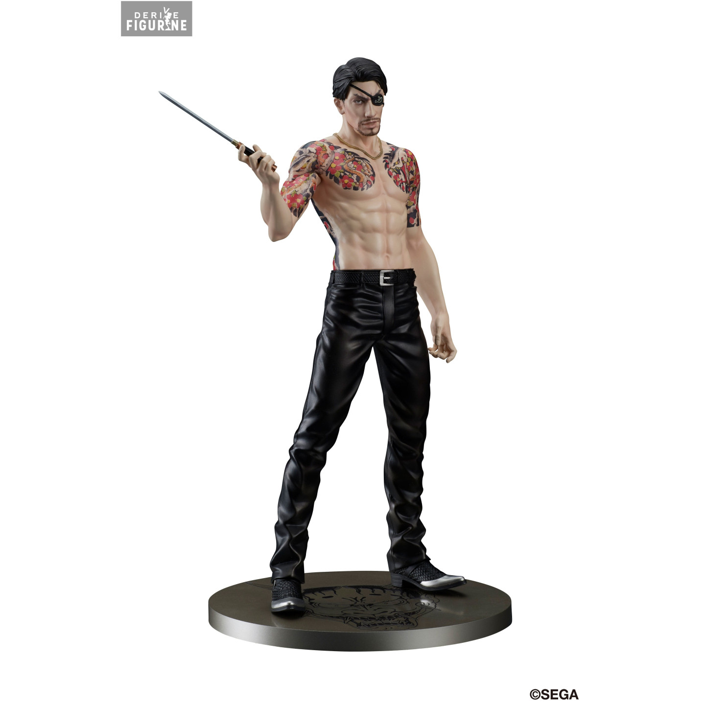The figure depicts him shirtless, revealing traditional Japanese tattoos covering his arms and back, powerful symbols of his ties to the underworld. His tight black faux-leather pants and black shoes enhance his intimidating appearance. His sharp gaze and the eyepatch over his left eye reinforce his dangerous aura, while the knife in his hand shows his readiness to strike without hesitation.
