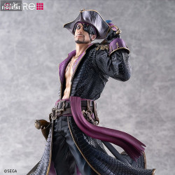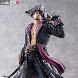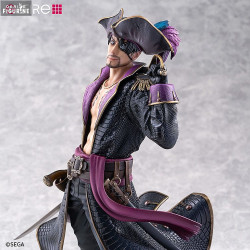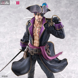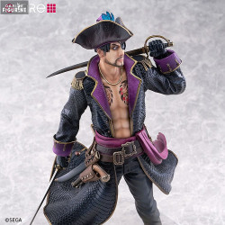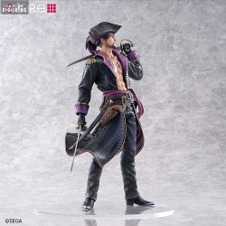 The figure presents Majima in a stunning pirate outfit: a textured black coat resembling reptile skin, lined with violet and gold, dark leather pants, and matching boots. His wide-brimmed hat, sword at his waist, and confident tilt of the body enhance his bold swagger. Classic features like his eye patch and gold necklace are faithfully included.