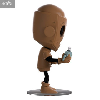 Le design de cette figurine vinyl reprend fidèlement son apparence stylisée : tête cubique aux grands yeux ronds, bouche rectangulaire, corps cylindrique orné d’un panneau de circuits, bras articulés et jambes fines. Il tient dans sa main un composant bleu-gris, prêt à l’insérer dans son système pour upgrader ses capacités. La posture légèrement penchée traduit sa nature toujours interrogative.