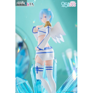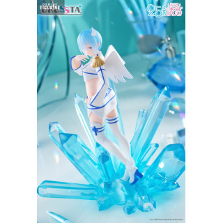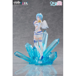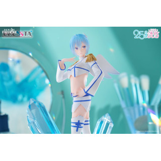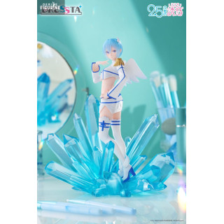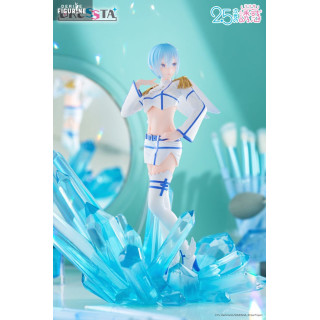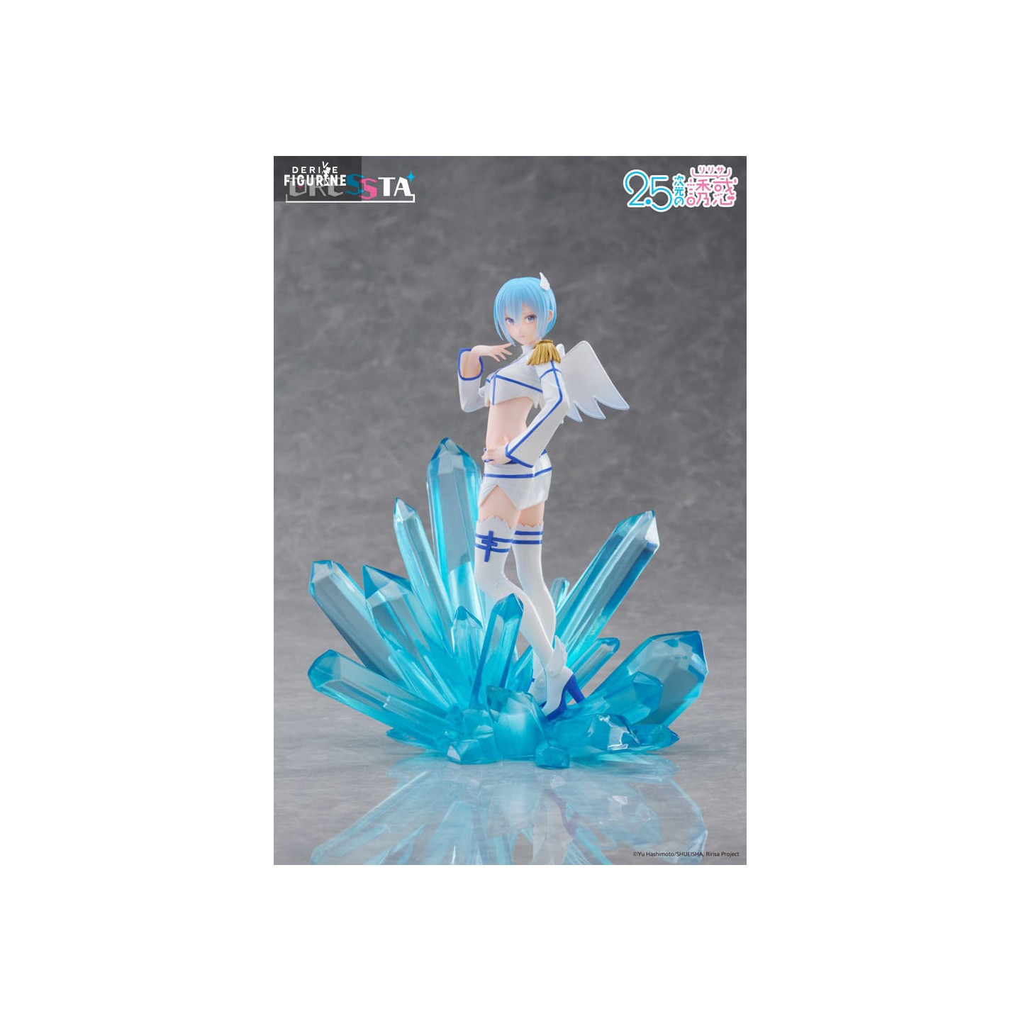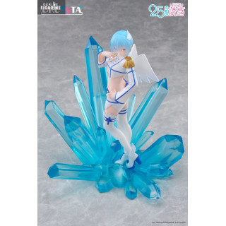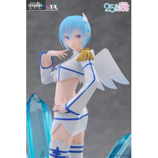 Le design de la figurine met en scène sa posture gracieuse : debout sur un lit de cristaux azur, une main effleurant sa joue, l’autre prête à libérer un souffle glacé. Sa tenue angélique modernisée associe une veste courte à épaulette dorée, un mini-short ajouré et des cuissardes blanches ourlées de bleu. Ses ailes stylisées et sa chevelure bleu perle, sculptées dans un PVC translucide partiel, complètent cet ensemble féerique.