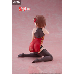 La figurine la représente agenouillée sur un sol rose, dans une pose élégante et discrètement séduisante. Elle porte une robe chinoise courte rouge à motifs dorés, fendue sur les cuisses, accompagnée de bas noirs et d’un accessoire fleuri dans les cheveux. Son expression douce et sa posture soignée donnent une impression de calme et de raffinement, loin de ses habituelles démonstrations de puissance.
