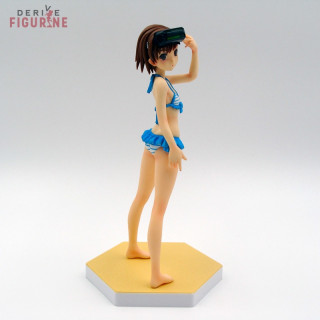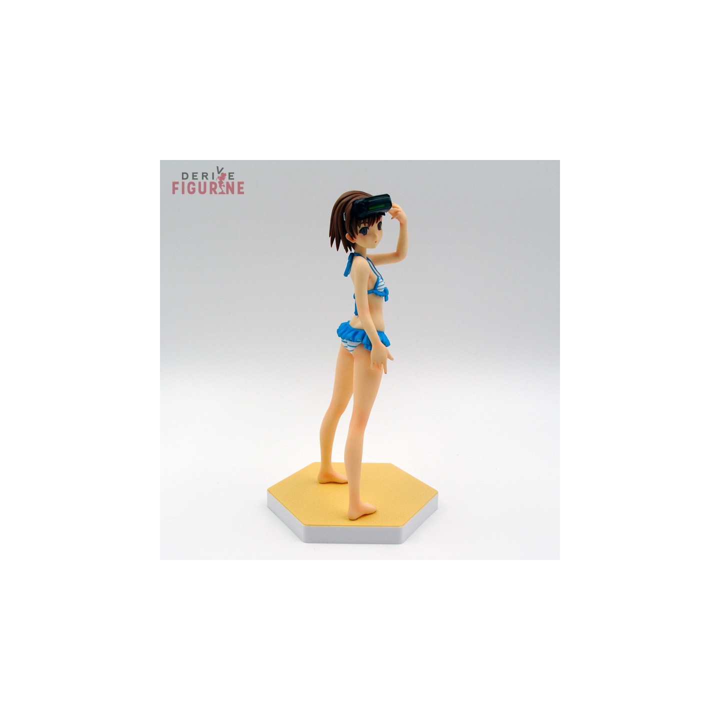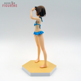 Figurine d'occasion et officielle de Mikoto Misaka en ABS/PVC d'environ 16 centimètres de haut à l'échelle 1/10. Mikoto porte un maillot de bain blanc et bleu et un masque sur le front. Il s'agit d'un objet d'occasion en bon état de la collection Beach Queens, avec une légère différence de couleur entre les jambes et le corps. Le fabricant est Wave Corporation, vendu avec boîte en assez bon état.
