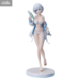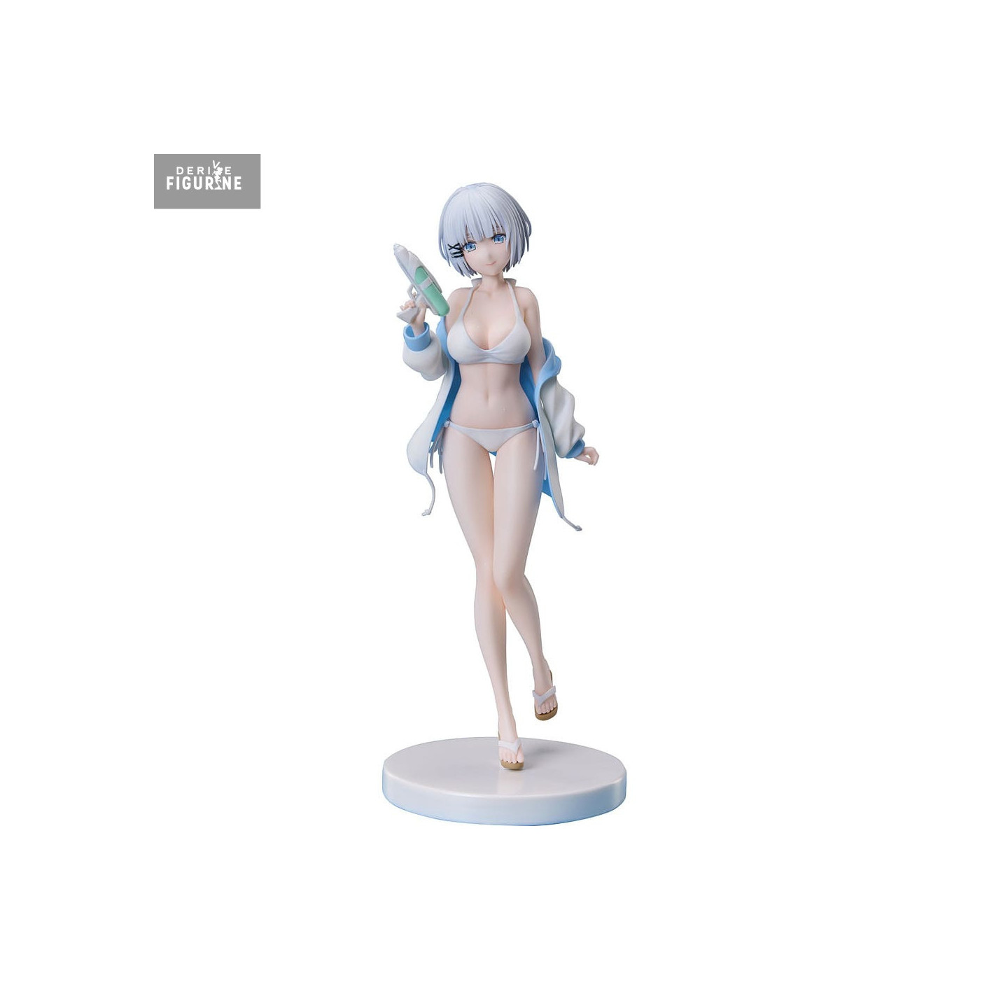 La figurine la représente debout sur un socle circulaire blanc, une boisson à la main. Son corps élancé, ses jambes croisées dans une posture naturelle, et ses sandales japonaises complètent l’ensemble avec cohérence. Sa chevelure argentée est sculptée avec finesse, chaque mèche accentuant la légèreté de l’ensemble.