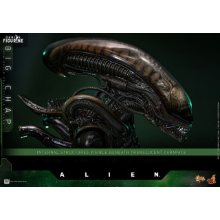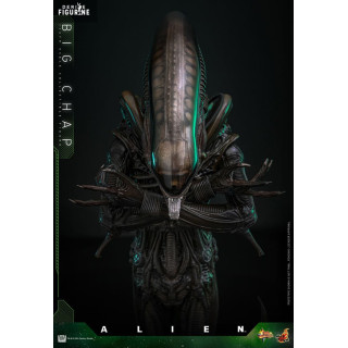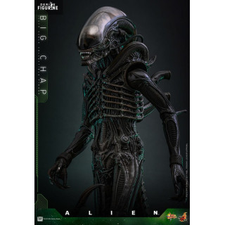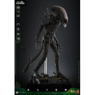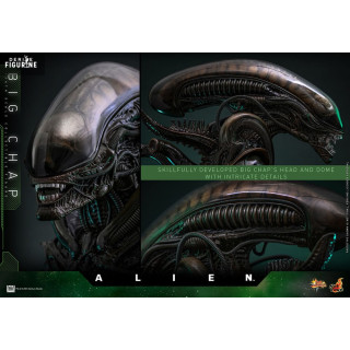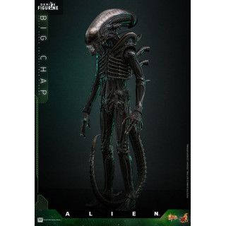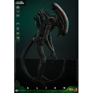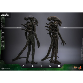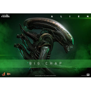Le Big Chap est présenté dans toute sa posture menaçante, grand et élancé, avec ses longs membres articulés, sa queue recourbée et son crâne lisse translucide qui laisse entrevoir des structures internes. Sa mâchoire secondaire extensible est également présente, prête à frapper. Chaque détail évoque la créature dessinée par H.R. Giger.