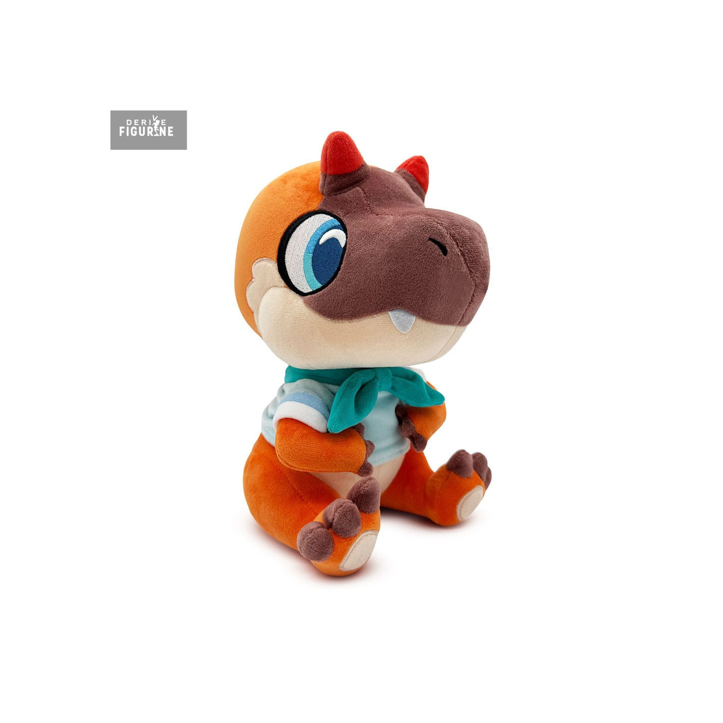 Le design joue sur des couleurs chaudes : orange vif sur le corps, brun chocolat sur le sommet du crâne, crème sur le ventre et le museau. Deux petites cornes rouges émergent de sa tête, tandis qu’un haut bleu clair et un foulard vert d’eau complètent sa tenue. L’ensemble est harmonieux, avec des finitions impeccables et un rendu très expressif.