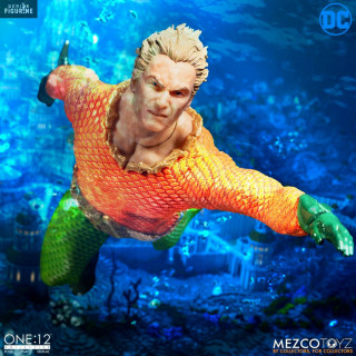 Figurine officielle de Aquaman mesurant environ 17 centimètres de haut. Le fabricant est Mezco Toys.