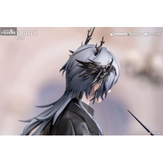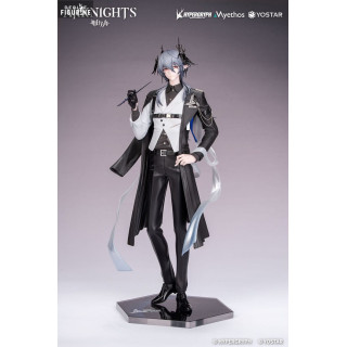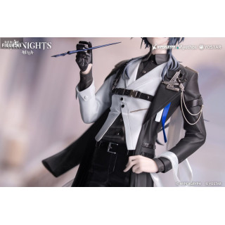 Son manteau noir fendu, son col blanc et les longs rubans flottants renforcent cette impression d’harmonie visuelle. On sent que tout est calculé, chaque pli, chaque geste, chaque détail. Même la base hexagonale donne une touche très « Arknights » : sobre, tranchée, efficace. Le regard, distant mais concentré, complète un tableau à l’élégance rare.