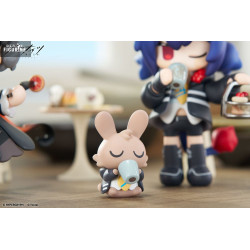 La figurine présente Ch’en avec sa coiffure bleue typique et ses cornes apparentes. Elle porte une tenue noire moderne, un tablier, et une écharpe rouge. Elle est accompagnée d’un petit animal buvant du thé, sur une base ornée de détails comme un plateau de desserts, une lanterne suspendue et un panneau décoratif en PVC aux motifs de lapin.
