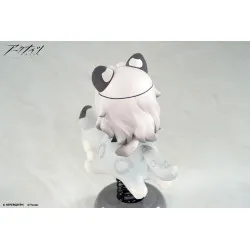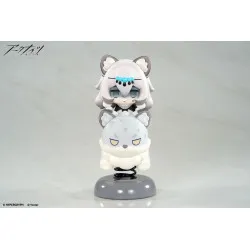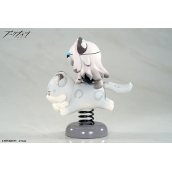 Visuellement, on la voit en version super déformée, avec de longs cheveux blancs et des oreilles animales gris clair. Sur le front, un petit bandeau est décoré de perles bleues, et son regard est à moitié fermé, très “pas impressionnée”. Elle est installée au-dessus d’une petite créature ronde blanche avec des taches gris clair, des yeux mi-clos et des pattes levées, le tout monté sur un ressort noir fixé à une base grise, ce qui donne l’effet “shake” une fois exposée.