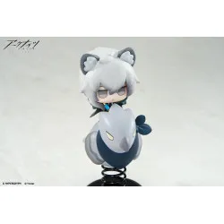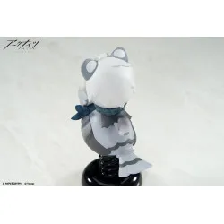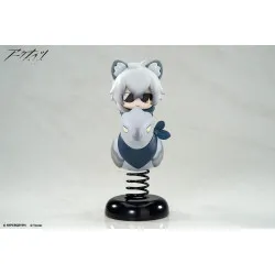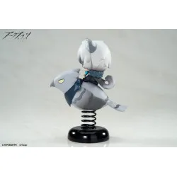 Visuellement, il a des cheveux gris et des oreilles animales assorties, avec des yeux à demi fermés qui donnent un air très calme. Il est installé au-dessus d’une petite créature stylisée aux tons gris et bleu sombre, avec un bec au centre et un large élément bleu façon col/écharpe, plus un nœud sur le côté. L’ensemble est monté sur un ressort noir fixé à une base noire brillante, ce qui donne l’effet “shake” et le rend facile à poser sur un bureau.