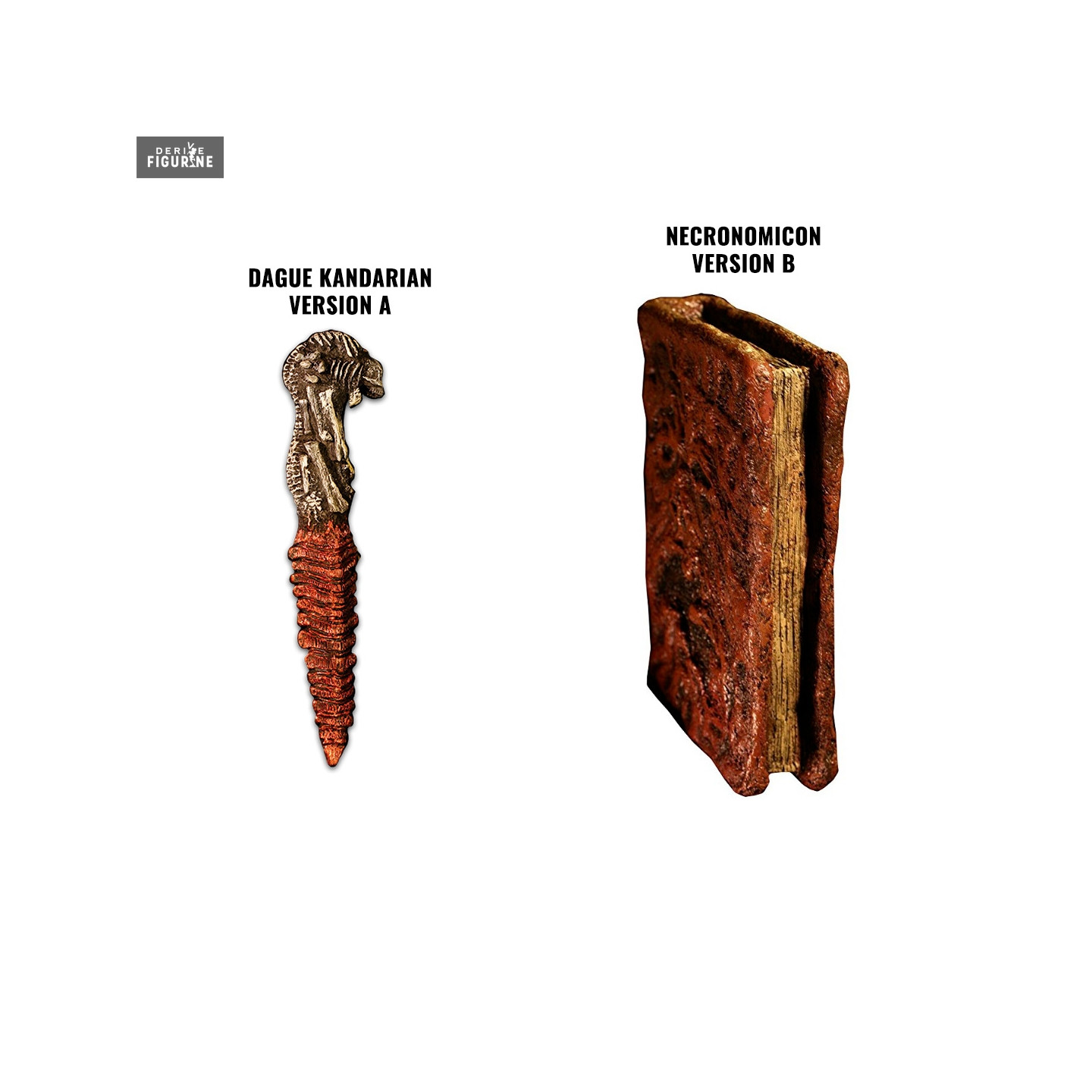 La dague de Kandarian (Version A) est en polyuréthane et mesure environ 67 centimètres de long, ce qui correspond à la même taille que celle du film. Pour ce qui est du Necronomicon (Version B), il est quant à lui en latex et en mousse et mesure environ 50 centimètres de haut pour 40 de large. A noter qu'il n'est pas possible de l'ouvrir.