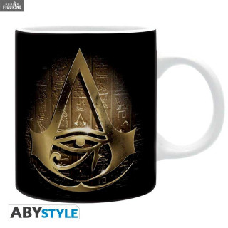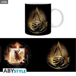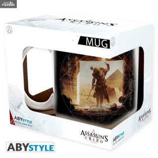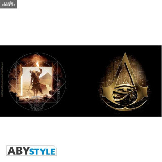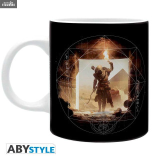 Ce coup-ci, Bayek est représenté une torche à la main sur ce mug. Il semblerait qu'il entre dans une pyramide pour l'explorer. De l'autre côté du mug, on peut voir l'emblème des assassins de couleur dorée avec des hiéroglyphes derrière lui.