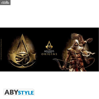 Sur ce mug, on peut voir Bayek avec sur son épaule son aigle du nom de Senu. Il tient un arc dans une mains et un bouclier dans l'autre. De plus, le fond de l'image est orné de hiéroglyphes, ce qui nous rappelle bien évidemment que Assassin's Creed Origins se déroule en Égypte.