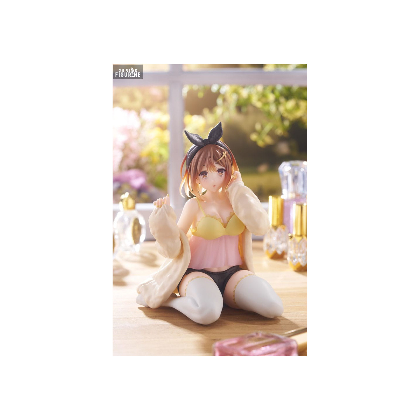 La figurine Ryza de Taito est une représentation fidèle de ce personnage aimé. Elle est assise en tailleur, portant une tenue de maison douce et décontractée composée d'un haut jaune pastel avec une bordure rose délicate, des shorts noirs et des bas blancs. Son expression douce et légèrement surprise, ainsi que ses cheveux bruns ornés d'un nœud noir, ajoutent à son charme et à sa simplicité. Le niveau de détail sur cette figurine est remarquable, depuis les plis de ses vêtements jusqu'à l'éclat dans ses yeux.