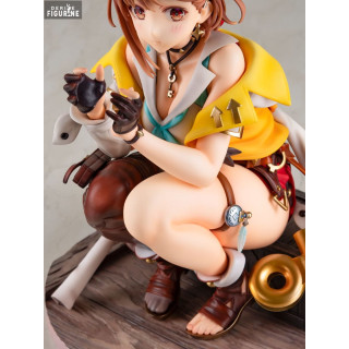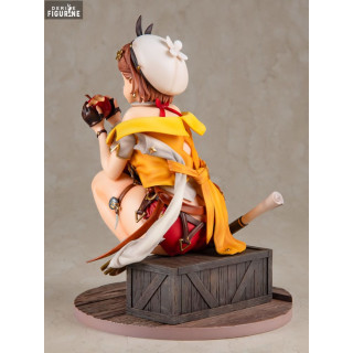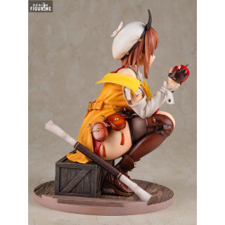 Cette figurine capture parfaitement l'esprit aventureux de Reisalin Stout, souvent appelée Ryza. Elle est représentée dans une pose dynamique, accroupie et tenant une pomme mordue, prête à partir pour une nouvelle aventure. Son costume détaillé, comprenant une veste jaune, des bottes en cuir, et divers accessoires, est fidèlement reproduit. La base de la figurine, avec ses caisses en bois et ses objets alchimiques, ajoute une touche d'authenticité et de réalisme à l'ensemble.