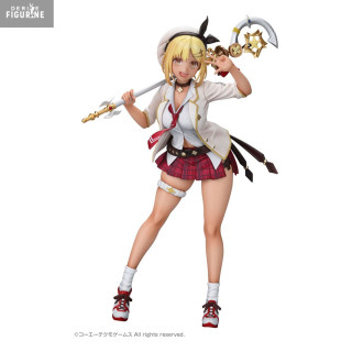 Medicos Entertainment propose ici une figurine à l’échelle 1/7, mesurant environ 25 cm de haut, qui capture parfaitement cette nouvelle facette de Ryza. La pose est dynamique et joyeuse : une main sur la hanche, l’autre tenant son bâton d’alchimiste posé sur l’épaule, sourire assuré et regard franc. L’uniforme académique réinterprété — veste courte, jupe plissée, chaussettes hautes et baskets — conserve l’identité visuelle de la série tout en y ajoutant une touche urbaine et fraîche.
