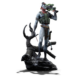 Sur Pandora, le colonel Miles Quaritch représente tout ce que la puissance militaire humaine a de plus implacable, même lorsqu’il se retrouve dans un corps de Na’vi. Cette statuette officielle en polystone d’environ 36 x 26 x 17,5 cm, à l’échelle 1/10, est signée Iron Studios au sein de la collection Art Scale. On le voit debout sur un socle qui évoque un tronc et des roches de la jungle pandorienne, arme en main, comme s’il avançait méthodiquement à la poursuite de sa proie.