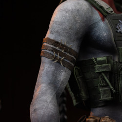 Les détails de la figurine mettent en valeur le contraste entre son physique de Na’vi et son équipement militaire humain : peau bleutée, silhouette élancée et pieds nus se mêlent au gilet pare-balles, aux poches utilitaires et aux accessoires accrochés à sa ceinture. Une écharpe rouge vif autour du cou apporte une touche de couleur marquante au milieu des tons sombres du gilet et du pantalon. Le fusil qu’il tient dans la main droite est finement sculpté, avec canon, chargeur et poignée bien définis. Le socle texturé représente un sol rocheux parcouru de racines et de branches brisées, offrant une base large et stable qui renforce la sensation de scène extraite du film.