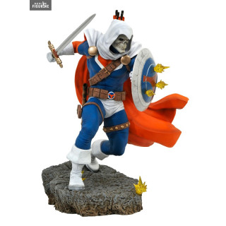 Cette figurine de Taskmaster est sculptée avec un soin méticuleux, capturant l'essence de son personnage dans une pose dynamique de combat. D'une main, il tient une épée prête à trancher, tandis que de l'autre, il utilise son bouclier emblématique, marqué par des impacts de balles, démontrant sa capacité à anticiper et contrer les attaques. La cape orange flottante et le masque de crâne emblématique de Taskmaster ajoutent à la menace de sa présence.