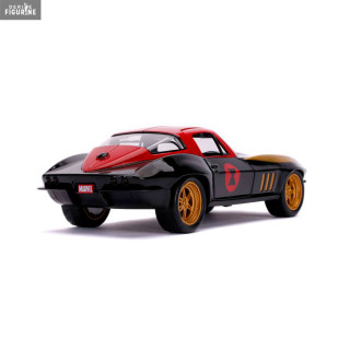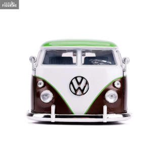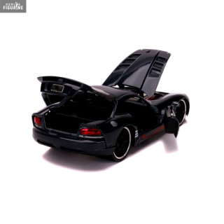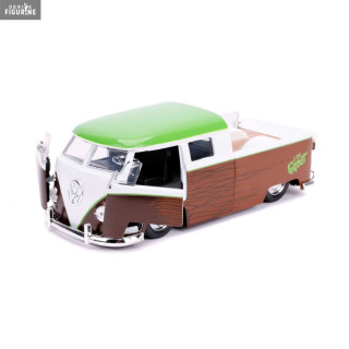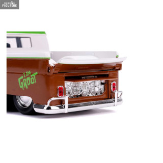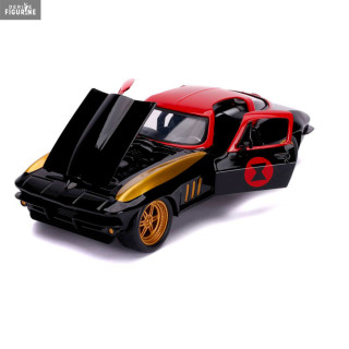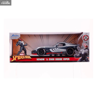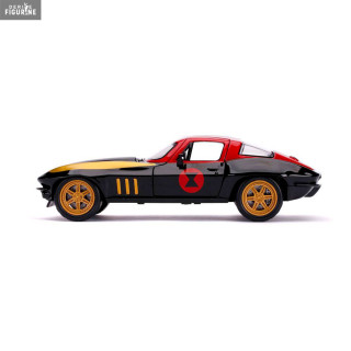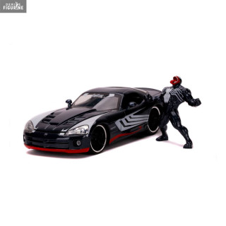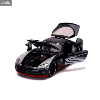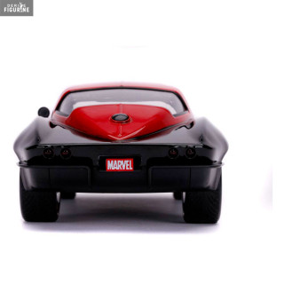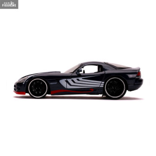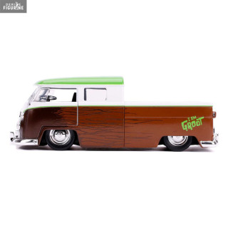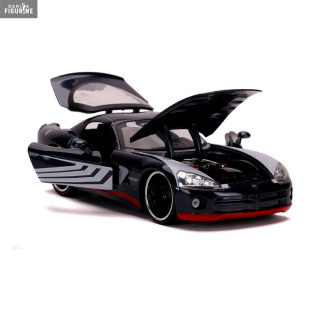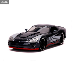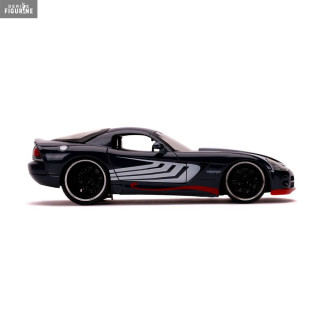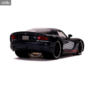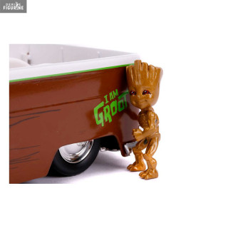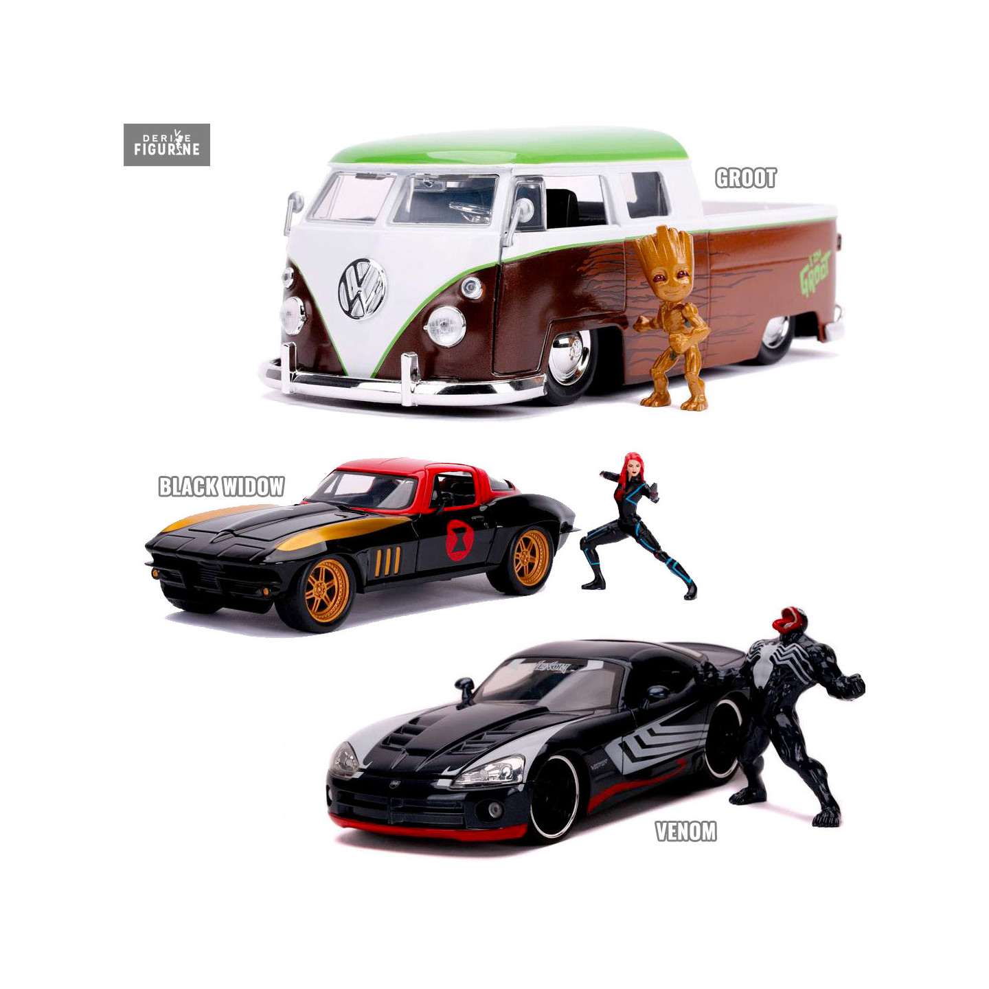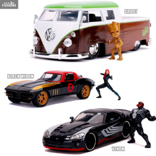 Figurine officielle au choix entre Groot + 1962 Volkswagen Bus, Black Widow + 1966 Chevy Corvette ou Venom + 2008 Dodge Viper SRT10 en métal die cast et plastique injecté, à l'échelle 1/24. Elle est issue de la collection Hollywood Rides. Le fabricant est Jada Toys.