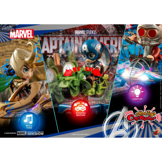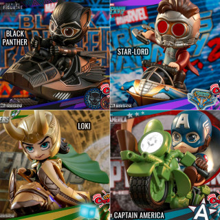 Figurine officielle au choix entre Black Panther, Star Lord, Captain America ou Loki mesurant environ 15 centimètres de haut. Elle est issue de la collection CosRider. Le fabricant est Hot Toys.