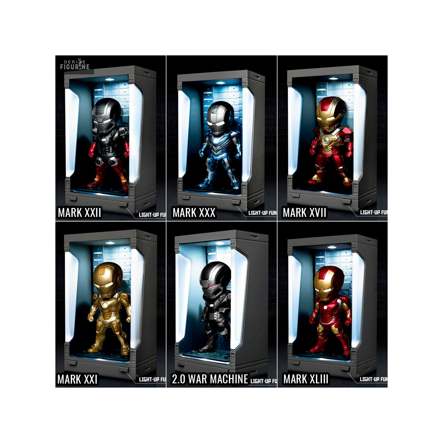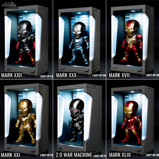 Figurine officielle au choix entre Iron Man Mark XXI, Mark XXII, Mark XVII, Mark XXX, Mark XLIII ou War Machine 2.0 mesurant environ 8 centimètres de haut. Elle est issue de la collection Mini Egg Attack. Le fabricant est Beast Kingdom.