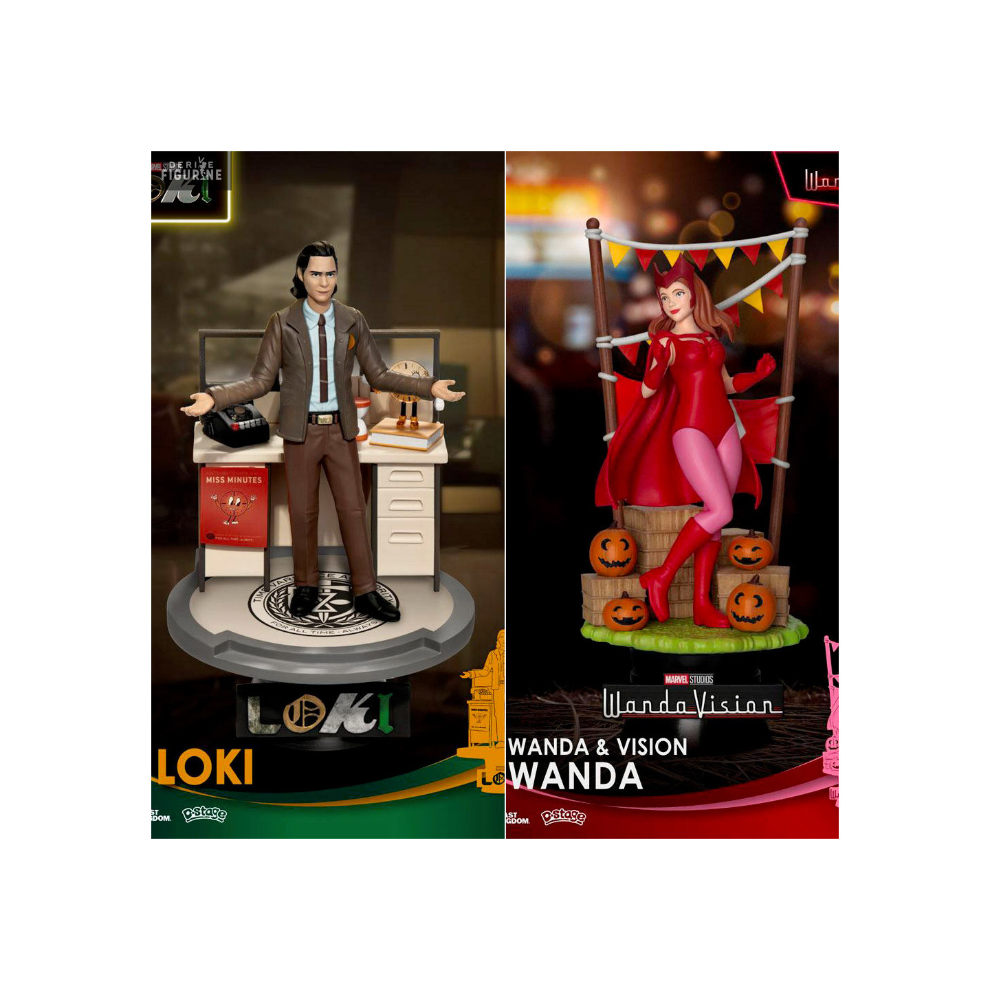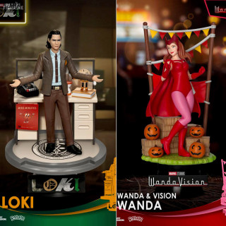 L'univers Marvel s'étoffe avec des séries sur la plateforme Disney+ afin d'avoir des informations supplémentaires sur certains personnages. Ici, vous avez justement le choix entre une figurine de Wanda dans sa tenue de sorcière rouge, ou Loki devant un bureau.