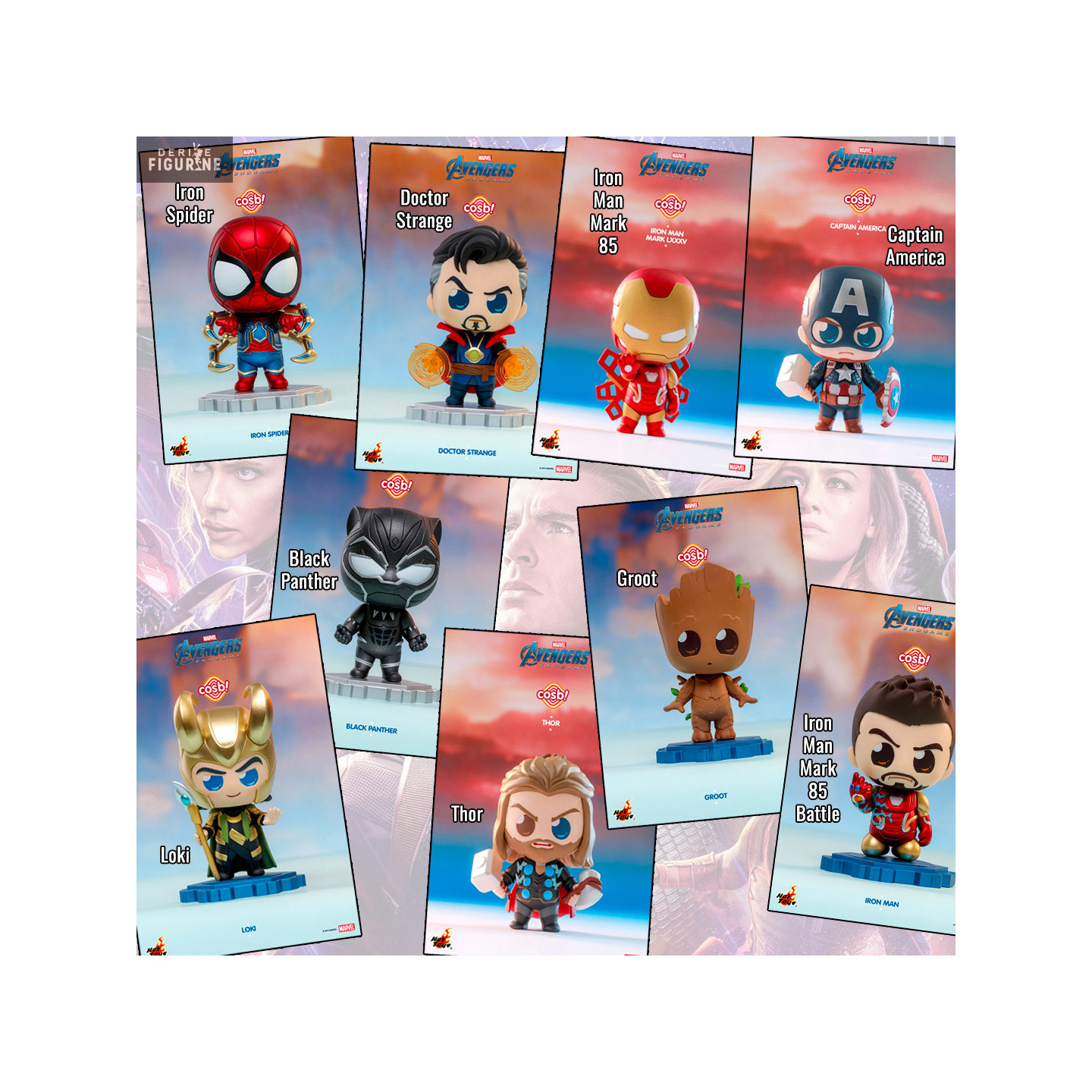 Figurine officielle au choix de Marvel, Avengers: Endgame entre Black Panther, Captain America, Doctor Strange, Groot, Iron Man Mark 85, Ion Man Mark 85 Battle, Iron Spider, Loki ou Thor en PVC mesurant environ 8 centimètres de haut. Elle est issue de la collection Cosbi. Le fabricant est Hot Toys.