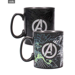 Mug thermoréactif des Avengers en céramique qui a une contenance de 40 cl. Ne pas utiliser avec le lave-vaisselle. Le fabricant est Half Moon Bay.