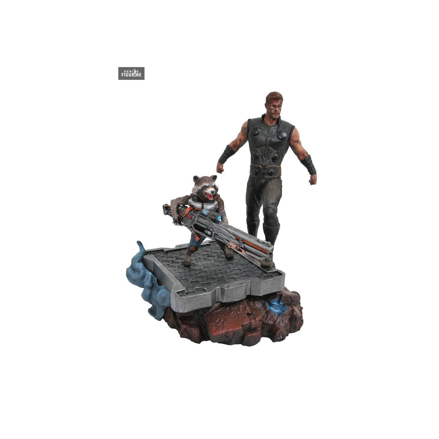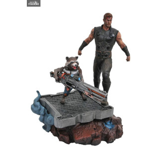 Figurine officielle de Thor & Rocket Raccoon en résine mesurant environ 30 centimètres de haut. Le fabricant est Diamond Select Toys.