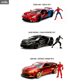 Véhicule + figurine au choix officiel, Spider-Man + Ford GT, Black Panther + Lykan Hypersport ou Iron Man + Chevrolet Camaro en métal Die Cast et plastique injecté, à l'échelle 1/24. Le fabricant est Jada Toys.