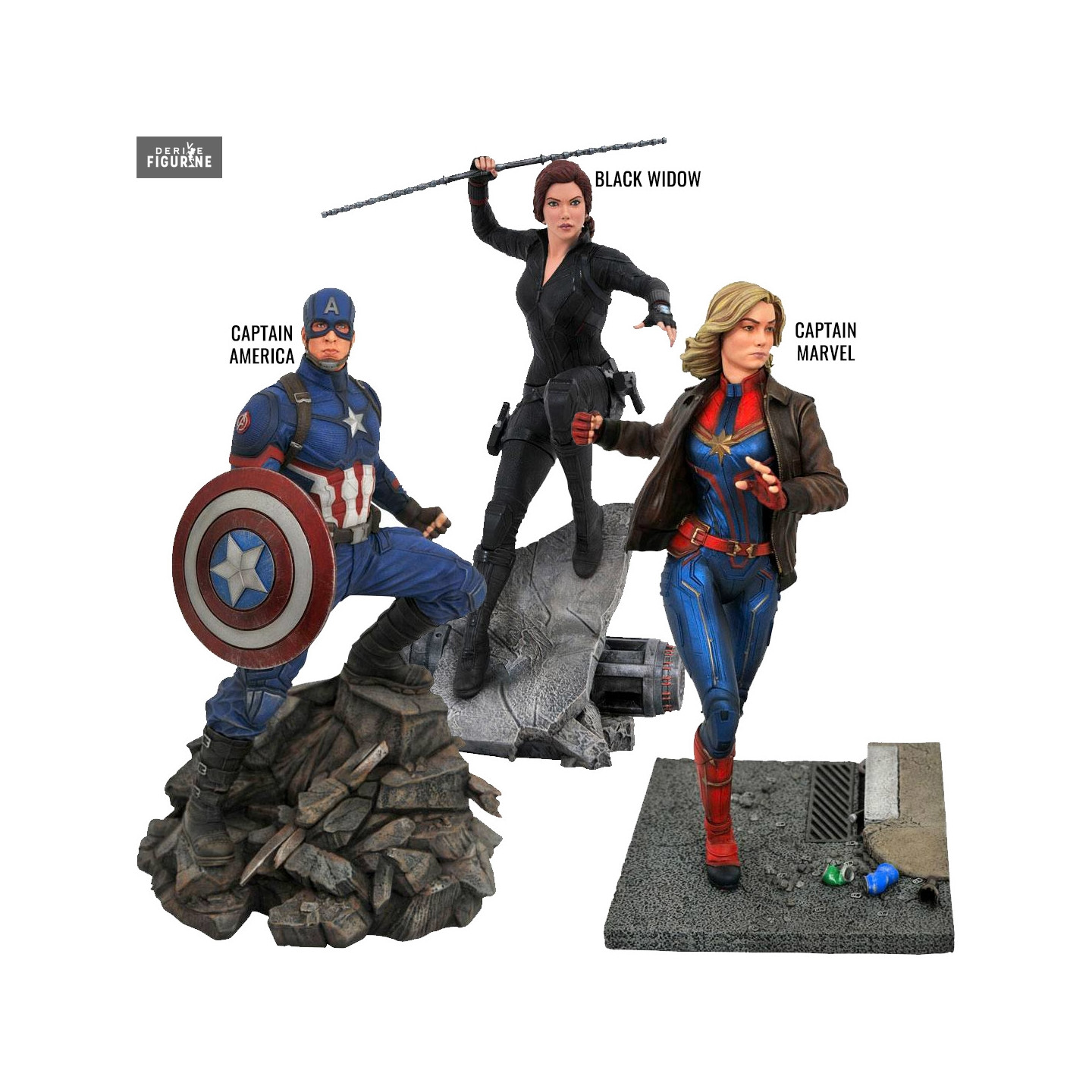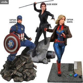 Figurine officielle au choix entre Captain Marvel (~28 cm), Black Widow (~30 cm) ou Captain America (~30 cm) en résine. Elle est issue de la collection Premier Collection. Le fabricant est Diamond Select Toys.
