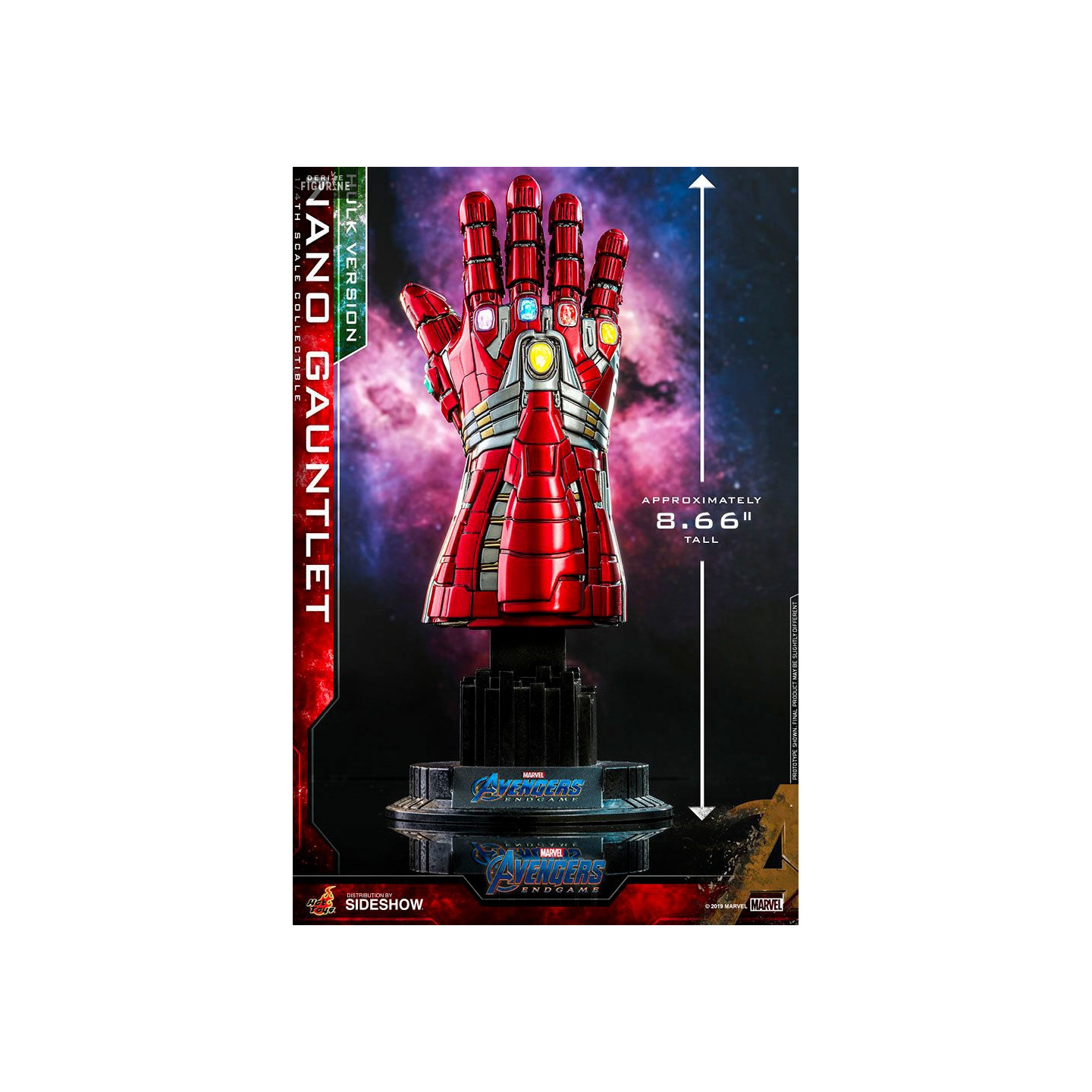 Réplique officielle du Nano Gauntlet de Hulk mesurant environ 22 centimètres de haut, à l'échelle 1/4. Fonctionne avec 3 piles AAA (non fournies). Le fabricant est Hot Toys.