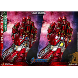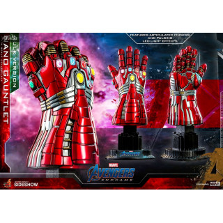 Afin de parvenir à faire revenir sur Terre tous les gens que Thanos a éliminé, Tony Star a mis au point un nouveau gant pour accueillir les gemmes d'infinité. La version que vous avez sous les yeux est celle qui est portée par Hulk. Grâce à des LEDs, chacune des six pierres peut s'allumer et les doigts sont articulés.