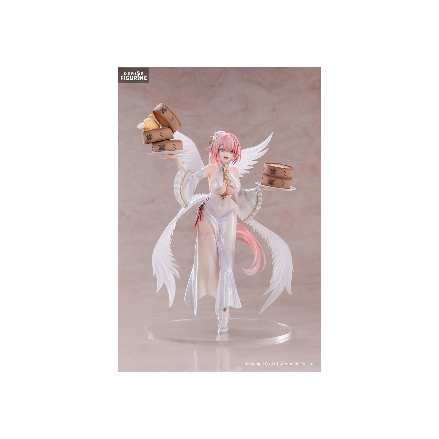 Ici, Theseus apparaît dans une tenue de cérémonie tout en blanc scintillant, inspirée des célébrations du Nouvel An. Sa robe fendue laisse deviner sa silhouette avec subtilité, tandis que des ailes immaculées déployées dans son dos ajoutent une dimension presque céleste à l’ensemble. Entre ses mains, elle porte plusieurs plateaux de délicieux dim sums, clin d'œil aux festivités gourmandes de la tradition chinoise, avec même un petit compagnon mochi tout sourire niché parmi les paniers vapeur.