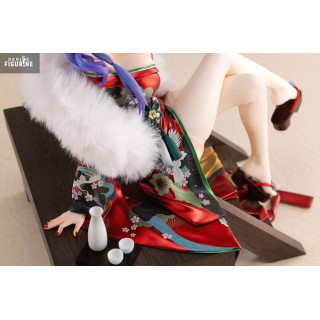 Son design met en valeur un kimono richement orné de motifs floraux, partiellement ouvert pour laisser apparaître ses jambes croisées. Une étole blanche en fourrure, des rubans rouges, ainsi qu’une fleur rouge dans ses cheveux violets complètent la composition. Chaque détail, de ses sandales traditionnelles à la carafe et la coupelle de saké posées près d’elle, accentue le raffinement de la mise en scène.