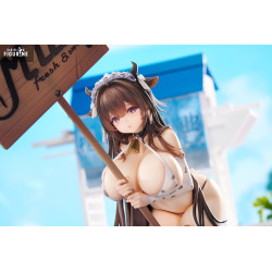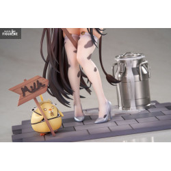 La figurine reprend fidèlement les codes du costume bovin : oreilles de vache, cornes, queue fine, motifs de pelage sur sa tenue blanche très échancrée, collier avec clochette et bas assortis. Ses longs cheveux bruns ondulent jusqu’au sol, contrastant avec sa peau claire et les tons laiteux de l’ensemble. La coiffe, les talons et les manchettes ajoutent une touche de raffinement à cette tenue déjà très expressive.