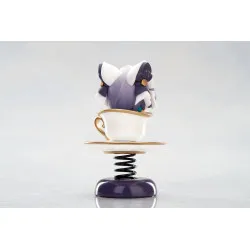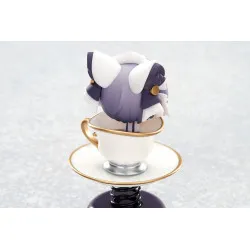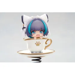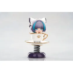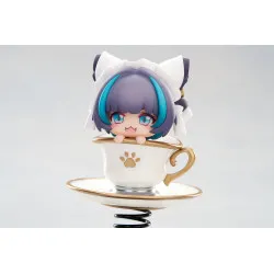 Visuellement, on la voit en format chibi, avec de grands yeux bleu clair, une petite bouche ouverte et des cheveux violet avec des mèches turquoise sur les côtés. Elle porte une coiffe blanche façon oreilles de chat, et elle dépasse d’une tasse blanche décorée d’une empreinte de patte dorée, avec une anse dorée et une soucoupe assortie. L’ensemble est posé sur un ressort noir fixé à une base violet foncé, ce qui donne un look “bobble” très fun à exposer.