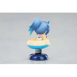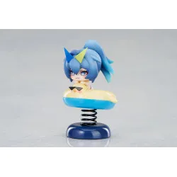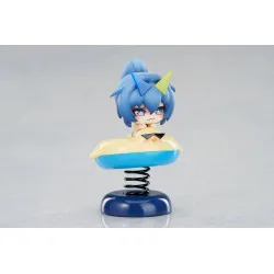 Visuellement, on la voit en format chibi, la tête posée sur ses bras, avec des yeux violet/rosé très marqués et un petit sourire. Ses cheveux sont bleus, attachés en une grosse mèche relevée, et elle porte deux accessoires triangulaires sur la tête, un bleu et un jaune, qui font penser à des petites cornes. Elle est installée dans une petite “capsule” jaune et bleu clair en forme de coque, avec un petit détail orange au centre. L’ensemble est monté sur un ressort noir fixé à une base bleu foncé, pour un effet “wobble” amusant à exposer sur une étagère.