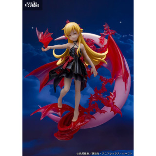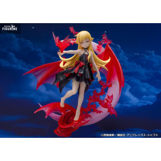 Shinobu Oshino, la vampire millénaire au charme énigmatique, se dévoile dans cette figurine officielle signée Proof. À l’échelle 1/7 et mesurant environ 24 cm de haut, elle est représentée en plein mouvement, pieds nus, vêtue de sa robe noire et rouge stylisée, entourée d’ailes translucides ourlées de pourpre et d’un croissant de lune ensanglanté.