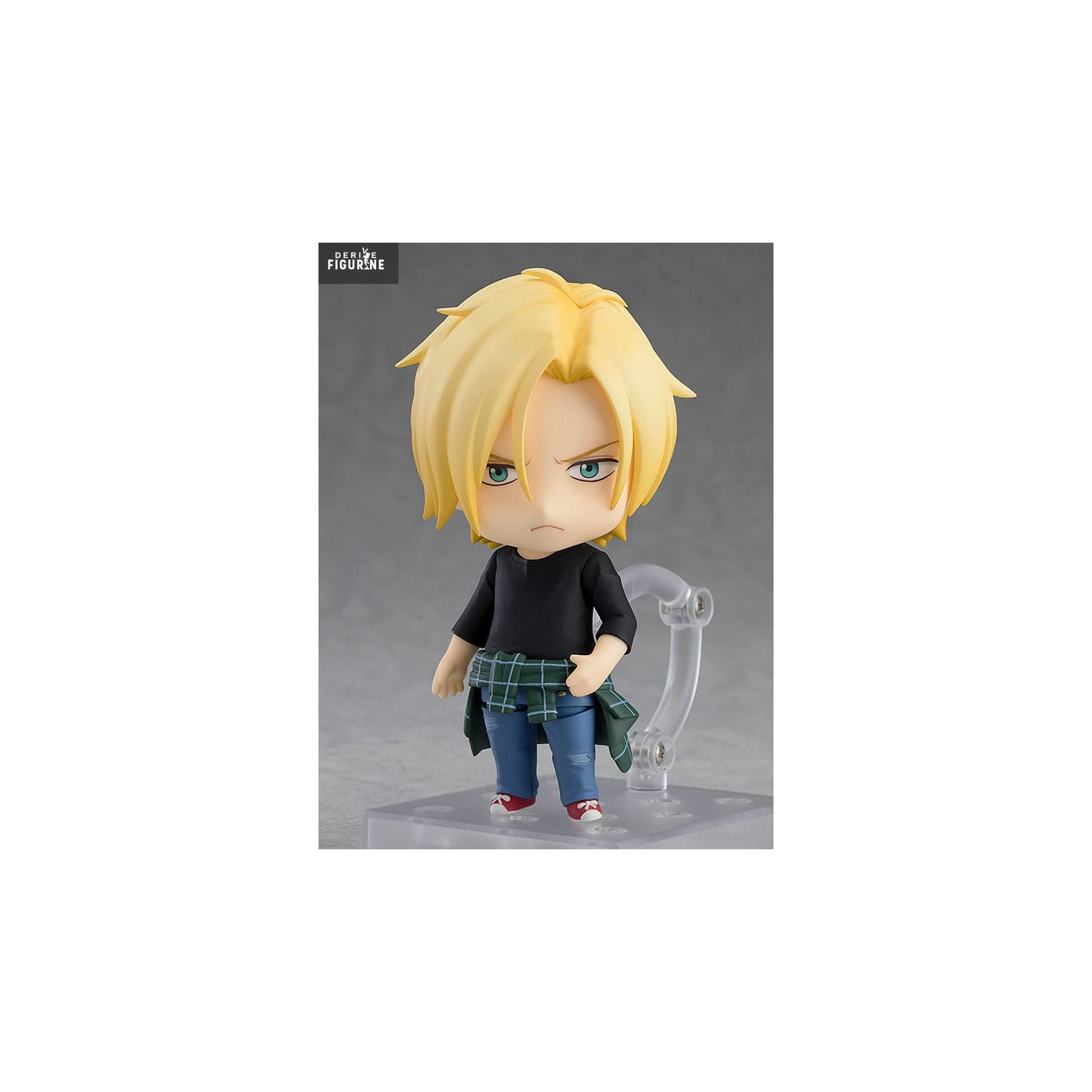 Cette Nendoroid restitue fidèlement son look de rue emblématique : t-shirt noir simple, jean déchiré et chemise à carreaux verte nouée autour de la taille, le tout surmonté de ses baskets rouges usées. Sa chevelure blonde, finement dégradée, encadre un visage aux traits déterminés. Les trois expressions – sérieux concentré, cri de rage et sourire en coin – permettent de capturer chacune des facettes de sa personnalité, du stratège froid au jeune homme vulnérable.