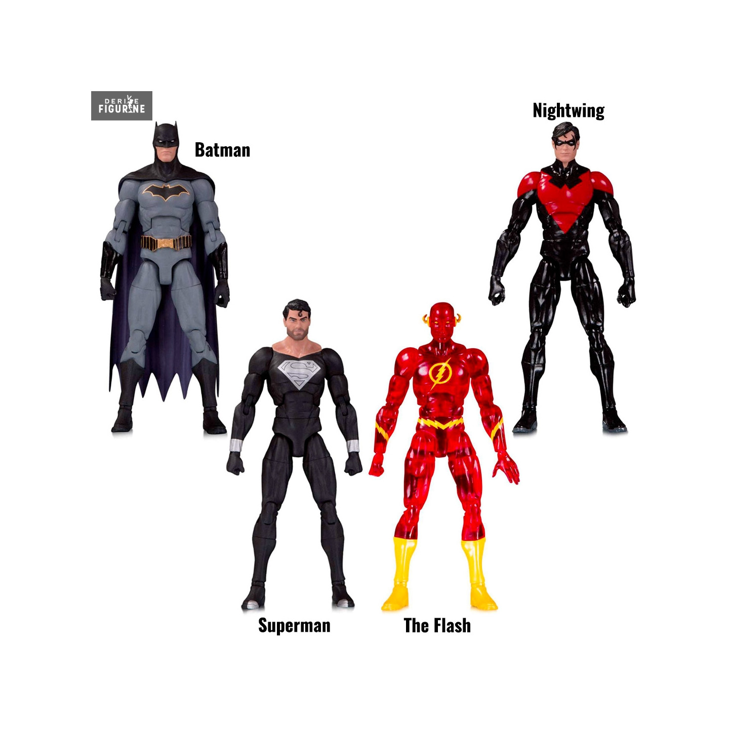 Quatre héros de DC Comics sont prêts à rejoindre vos rangs. Vous avez donc le choix entre Batman (Rebirth) version 2, Superman (The Return of Superman), The Flash (Speed Force) et enfin Nightwing (New 52). Ils ont tous enfilés leur tenue de super-héros et sont articulés pour vous permettre de leur donner les poses que vous voulez.